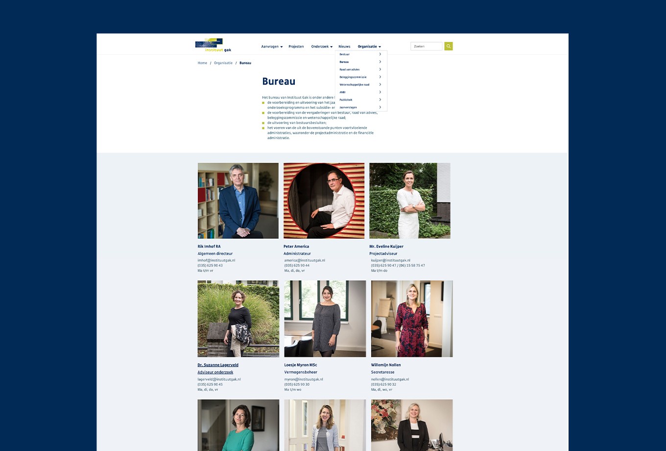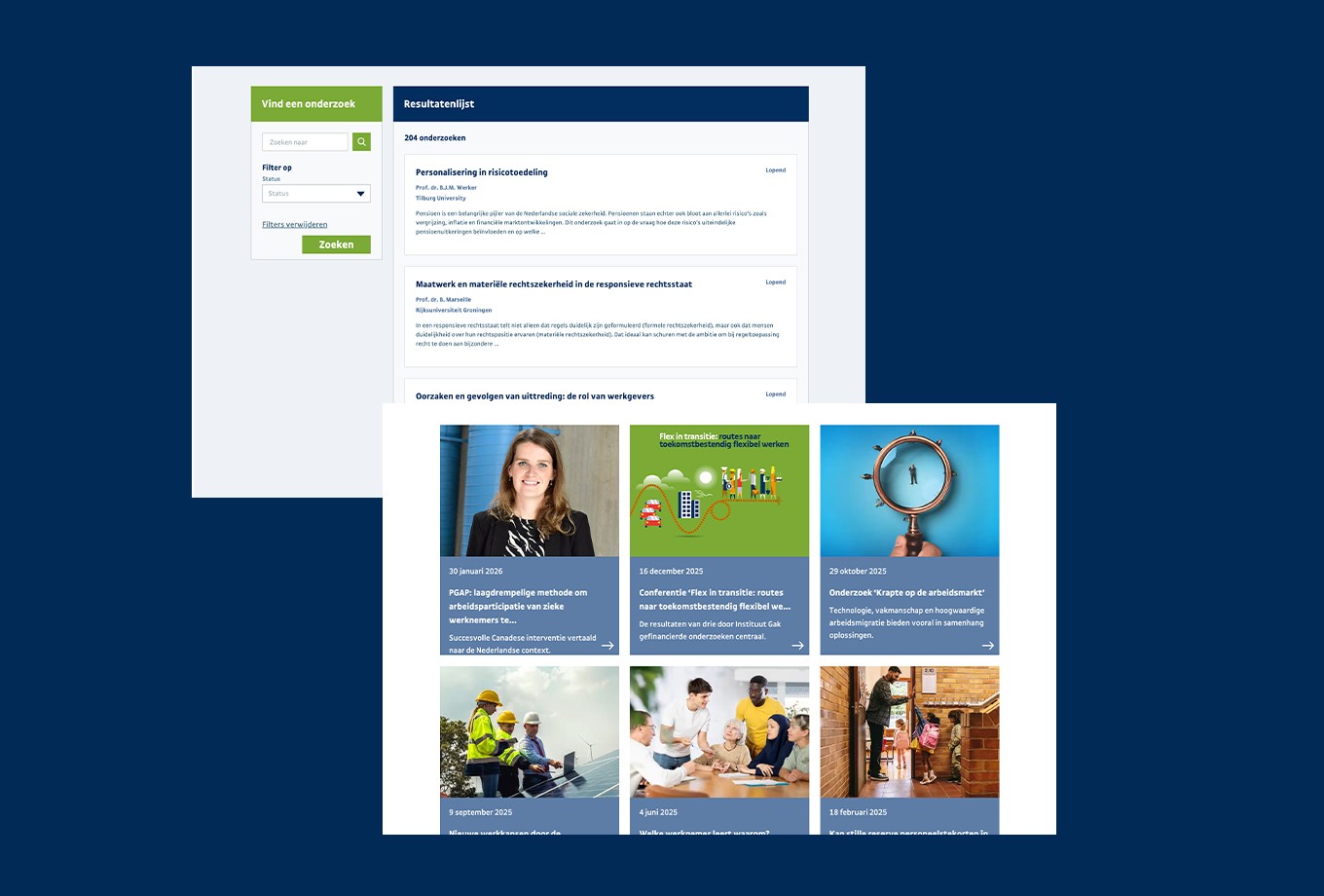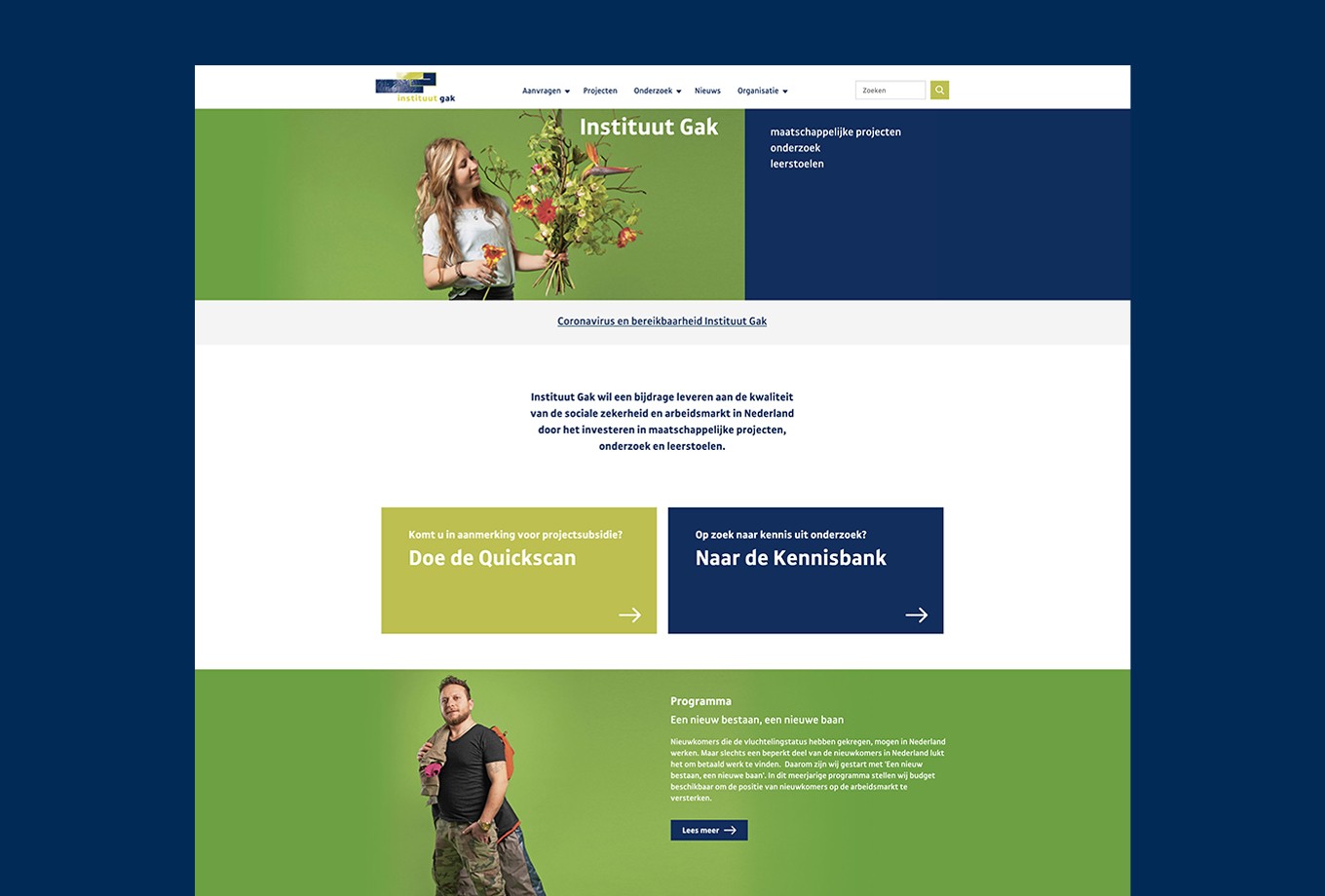 By analysing the “old” website and cooperate with Institute Gak we identify that “quickscan” and “kennisbank” are the main functionalities the target audience uses. We prioritise these as main CTA on the landings page. Next, we created a clear menu structure and a fresh look & feel Presented in a digital style guide, which ensures that the website is clear and user-friendly.