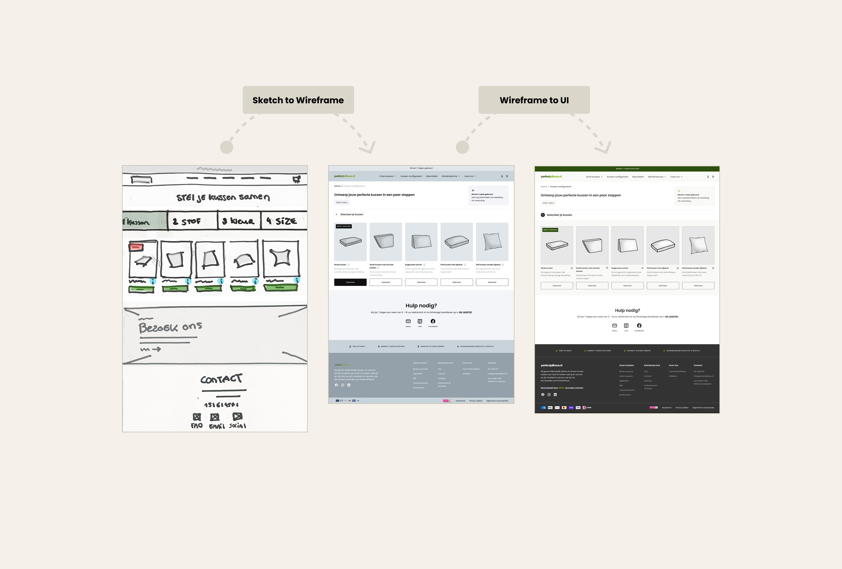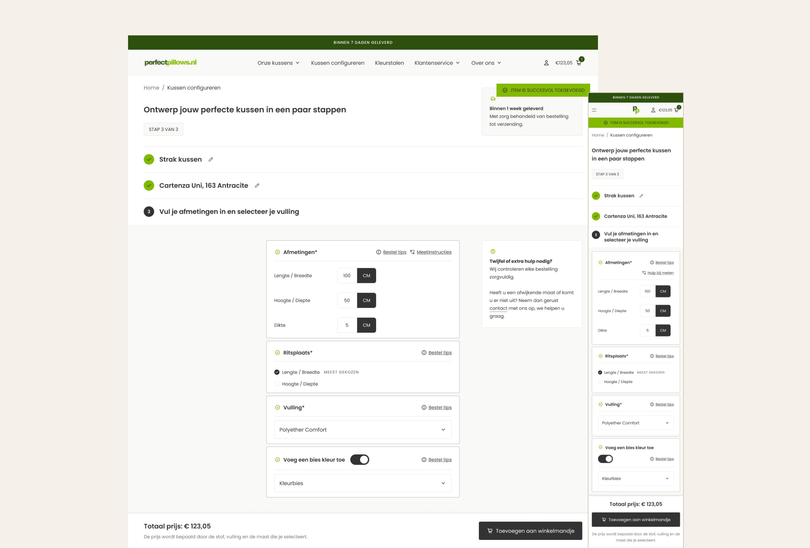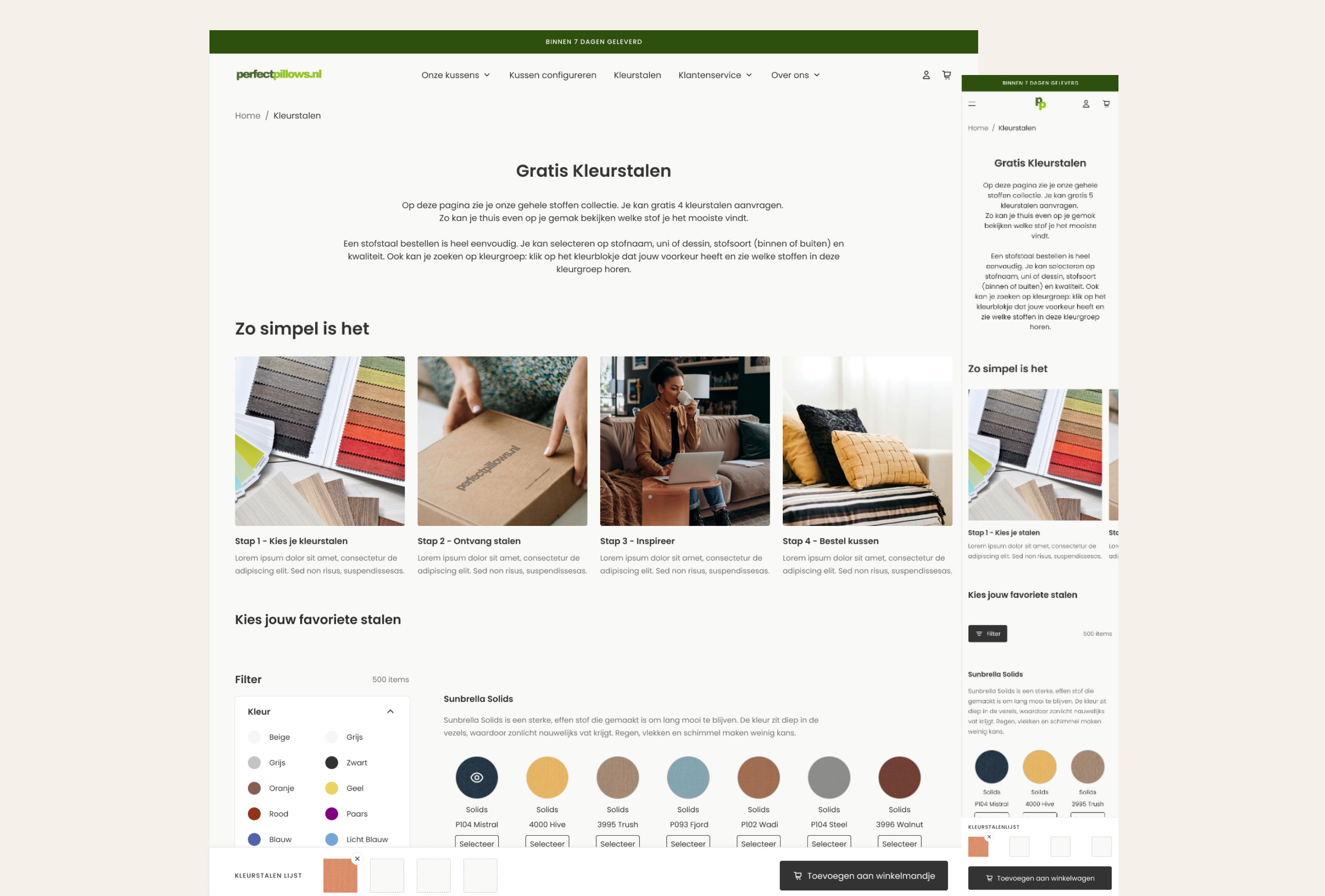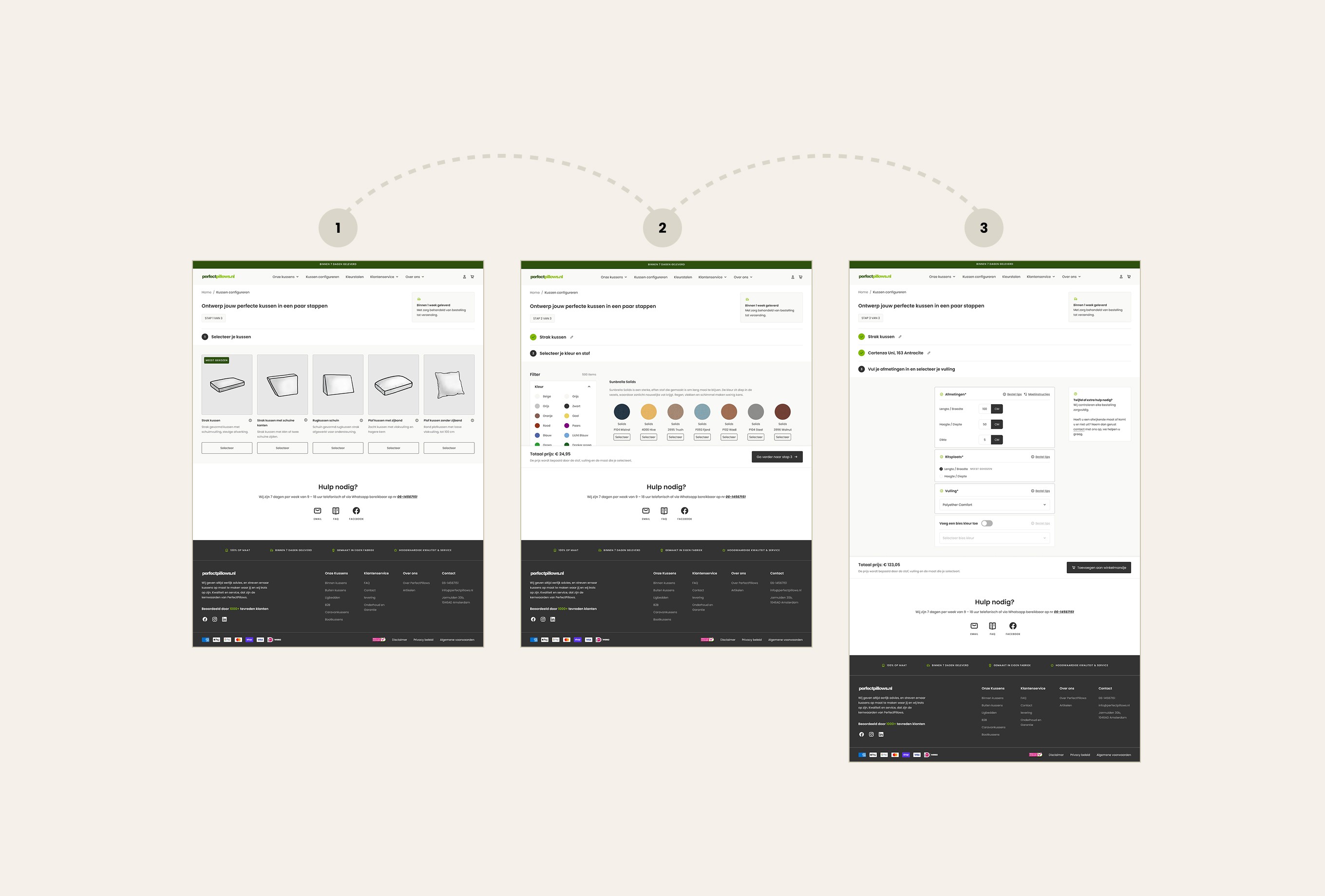 The main challenge was creating a pillow configurator that allows users to compose their ideal pillow in three steps: step 1 – shape, step 2 – fabric, step 3 – size. Based on the user’s selections, the price needed to update instantly. We solved this with a clear three-step flow, where users see a live price update at the bottom of the viewport. Users can easily switch between steps and only add the pillow to the cart in the final step. In addition to the configurator, users needed the option to order four free swatches. We addressed this by adding a swatch bar at the bottom of the screen, giving users a clear overview of their selected samples, with the ability to easily add or remove them from the cart. In total, 13 sections were designed, allowing users to easily build and customize their own pages. The existing colors and typography were translated into a clean design. The result is a functional webshop that delivers exactly what is needed, fully aligned with the client’s goals.