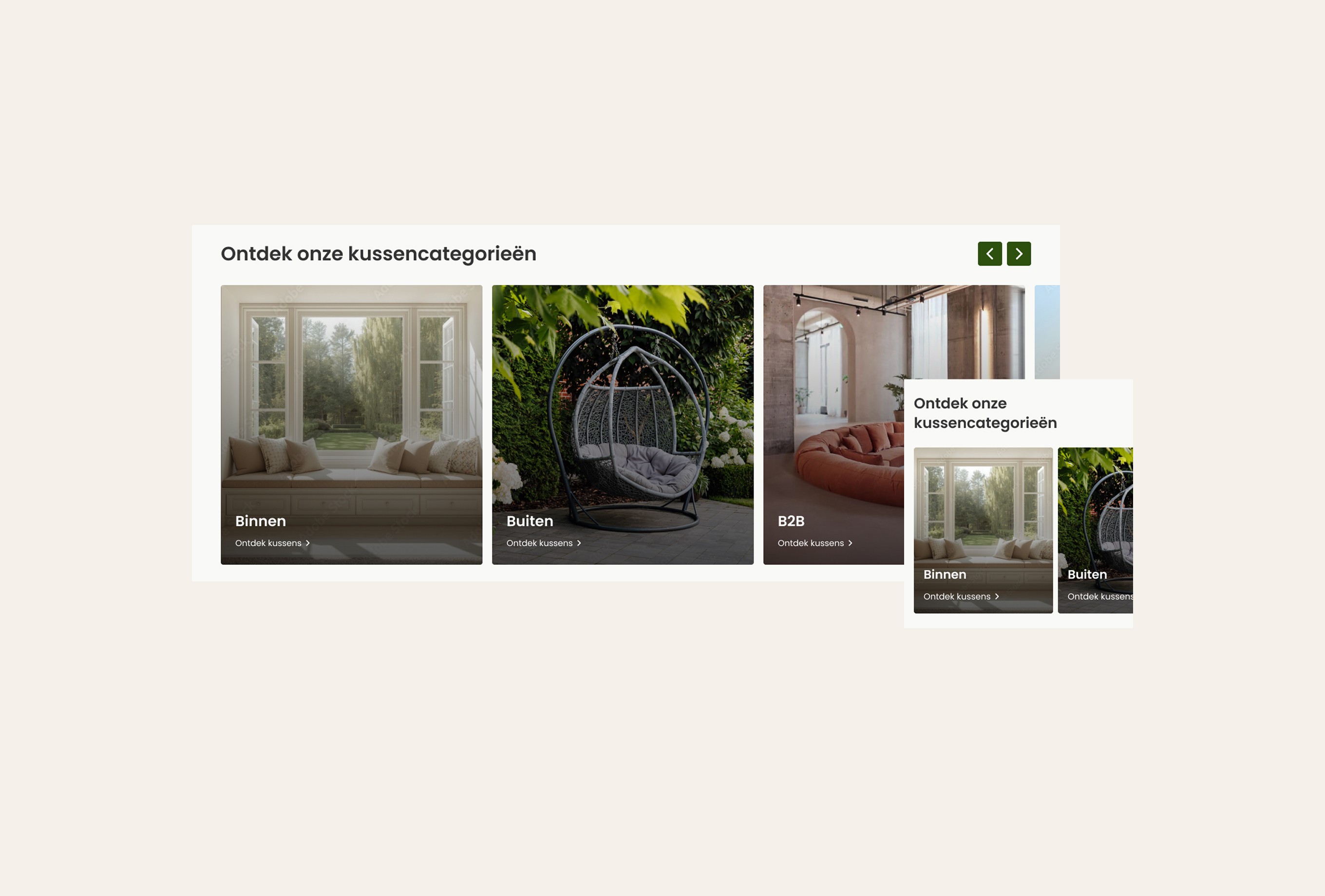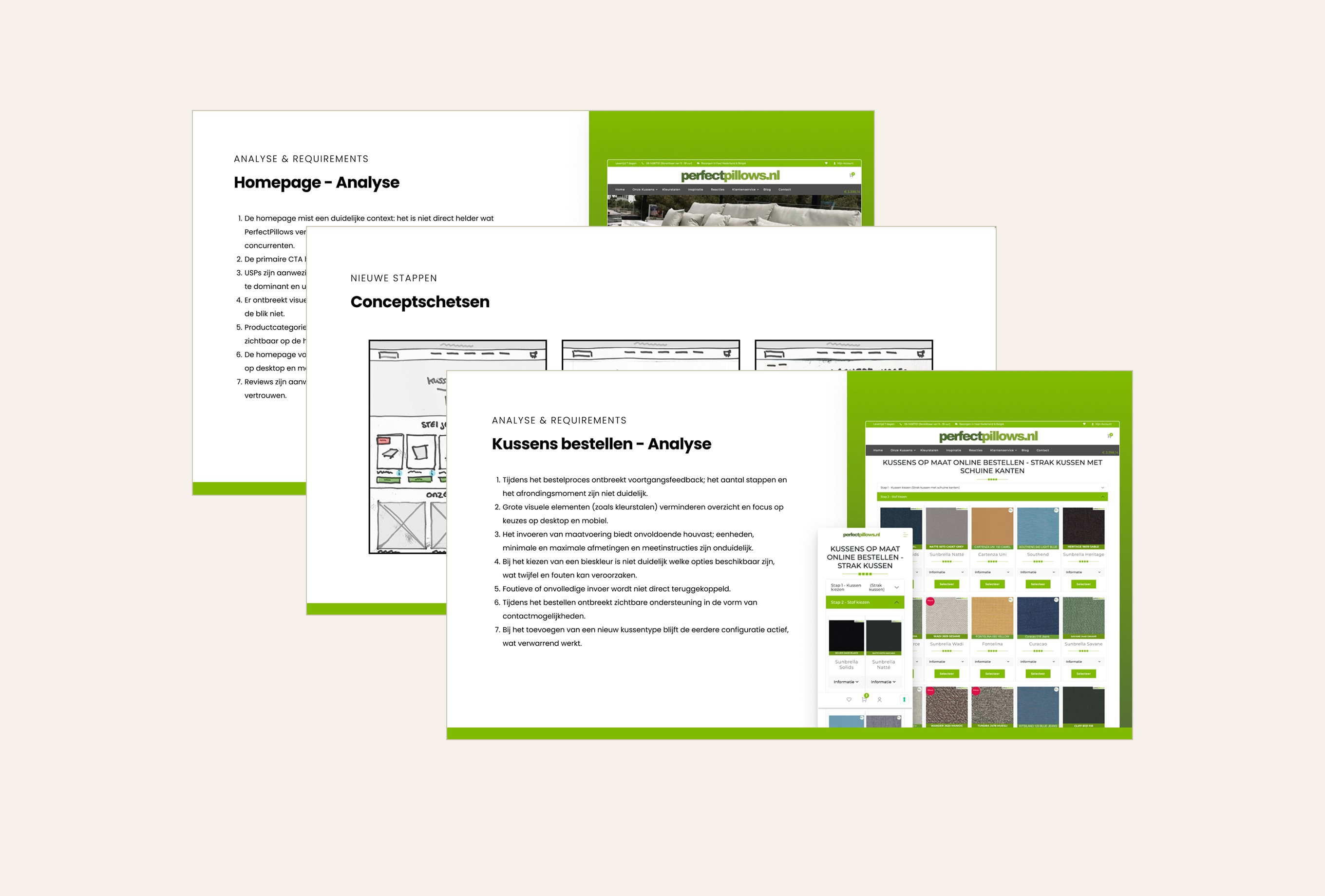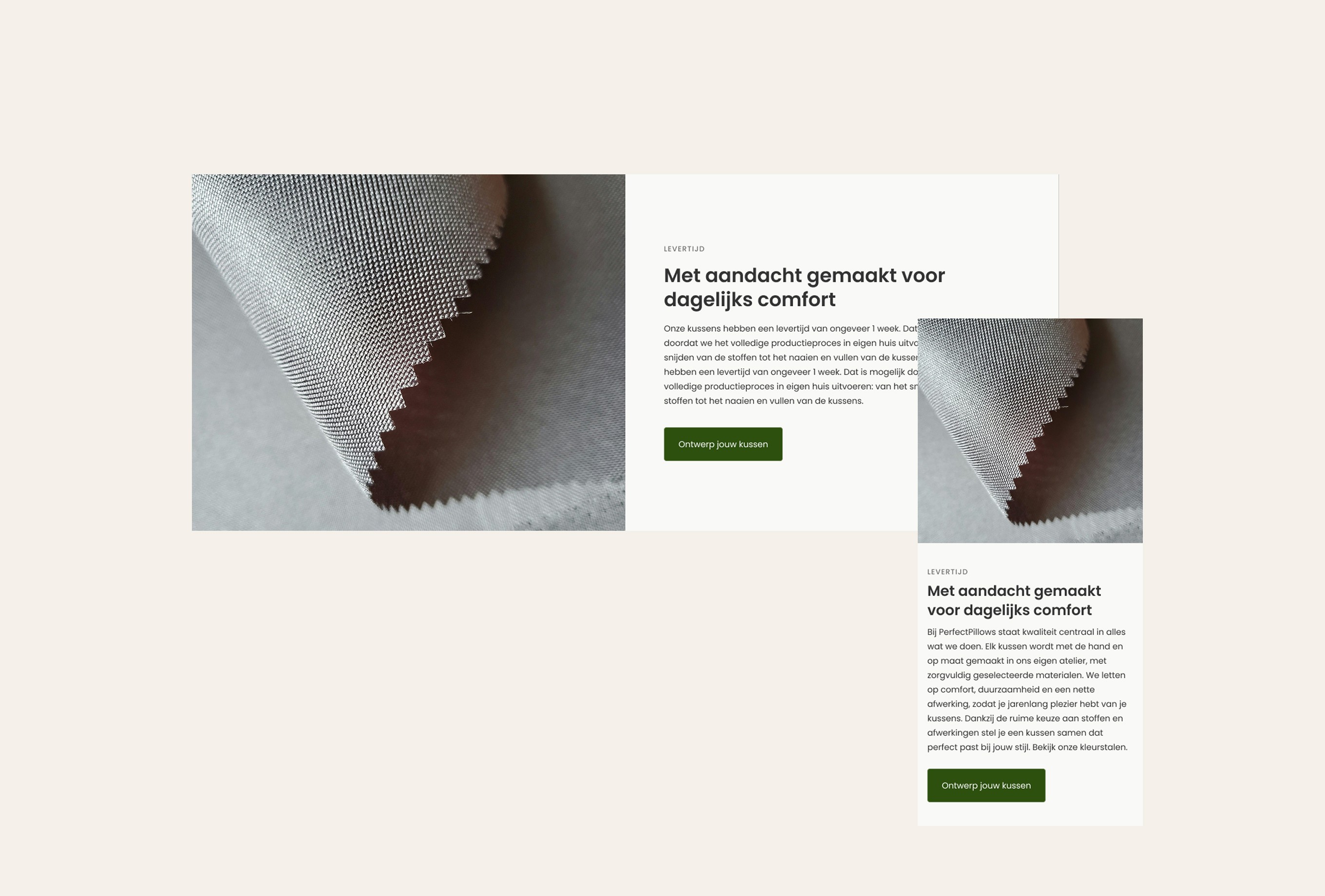 The main challenge was creating a pillow configurator that allows users to compose their ideal pillow in three steps: step 1 – shape, step 2 – fabric, step 3 – size. Based on the user’s selections, the price needed to update instantly. We solved this with a clear three-step flow, where users see a live price update at the bottom of the viewport. Users can easily switch between steps and only add the pillow to the cart in the final step. In addition to the configurator, users needed the option to order four free swatches. We addressed this by adding a swatch bar at the bottom of the screen, giving users a clear overview of their selected samples, with the ability to easily add or remove them from the cart. In total, 13 sections were designed, allowing users to easily build and customize their own pages. The existing colors and typography were translated into a clean design. The result is a functional webshop that delivers exactly what is needed, fully aligned with the client’s goals.