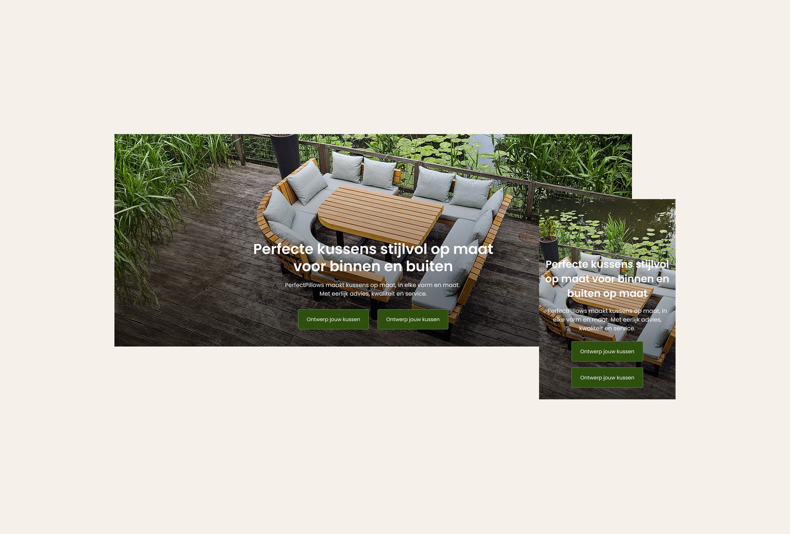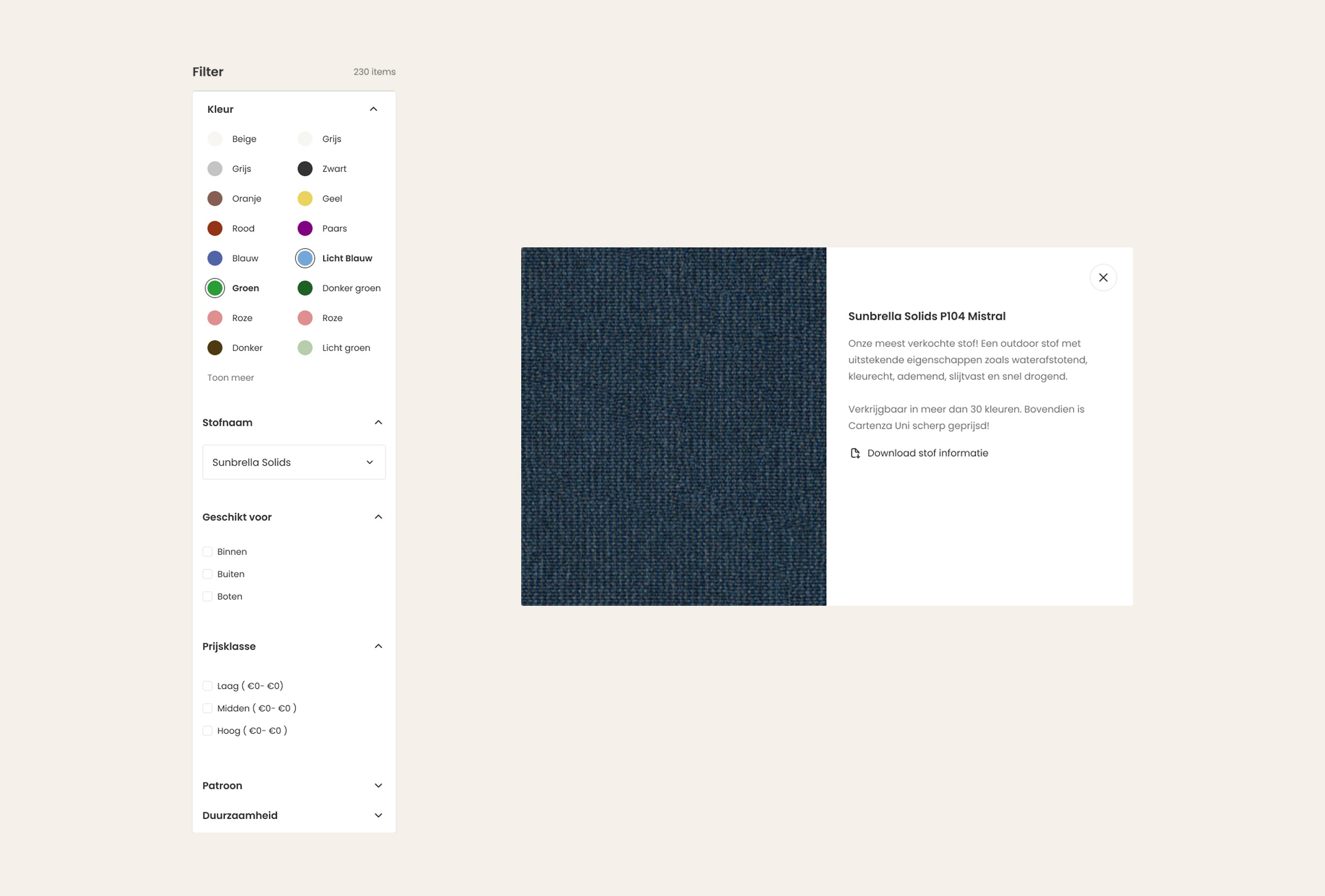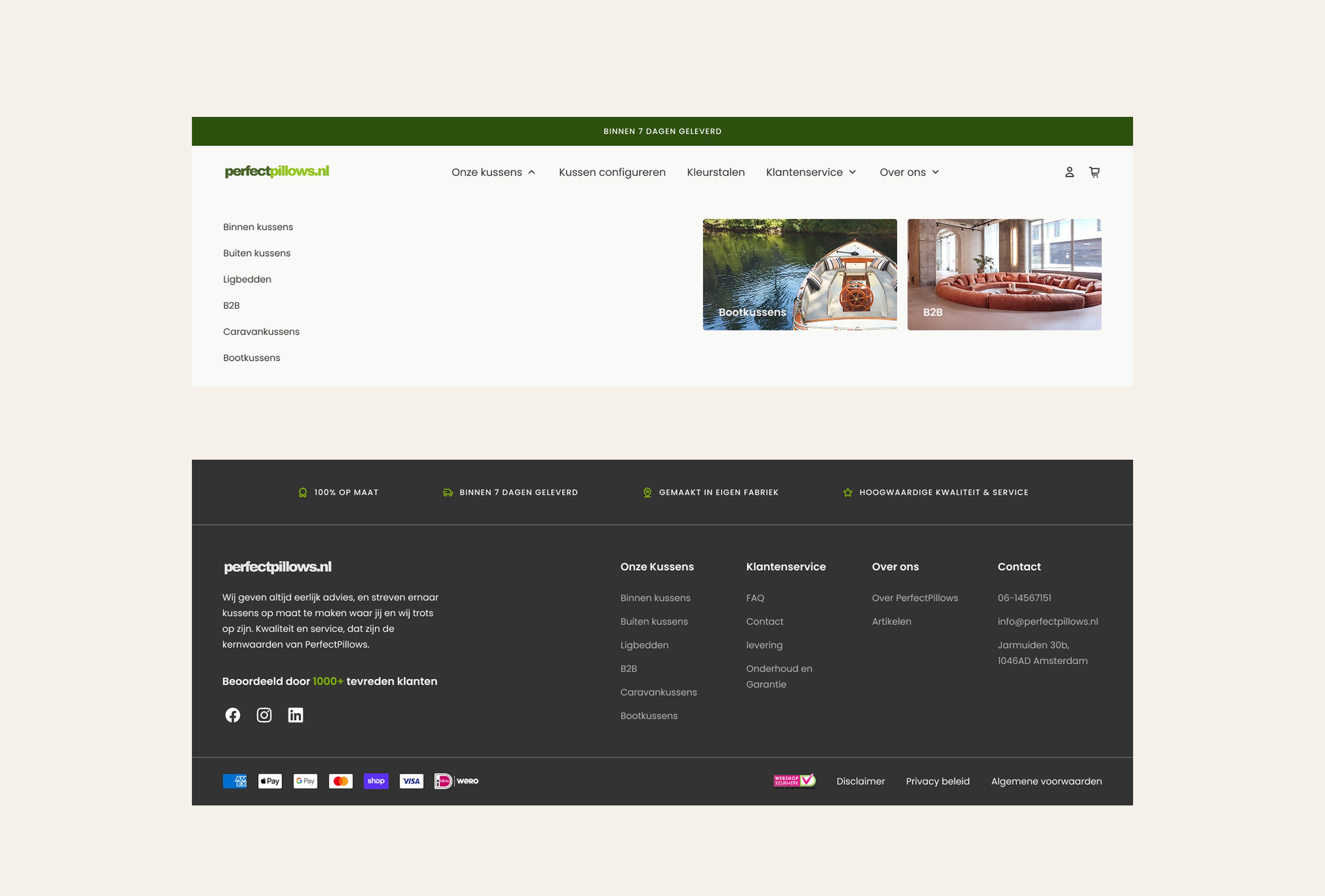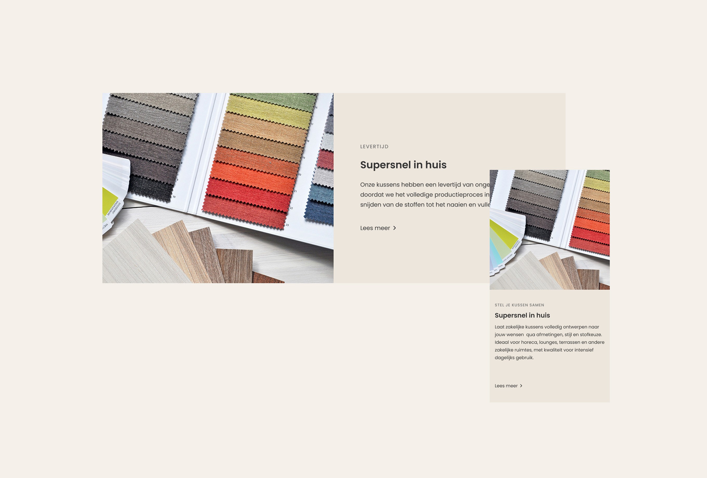 The main challenge was creating a pillow configurator that allows users to compose their ideal pillow in three steps: step 1 – shape, step 2 – fabric, step 3 – size. Based on the user’s selections, the price needed to update instantly. We solved this with a clear three-step flow, where users see a live price update at the bottom of the viewport. Users can easily switch between steps and only add the pillow to the cart in the final step. In addition to the configurator, users needed the option to order four free swatches. We addressed this by adding a swatch bar at the bottom of the screen, giving users a clear overview of their selected samples, with the ability to easily add or remove them from the cart. In total, 13 sections were designed, allowing users to easily build and customize their own pages. The existing colors and typography were translated into a clean design. The result is a functional webshop that delivers exactly what is needed, fully aligned with the client’s goals.